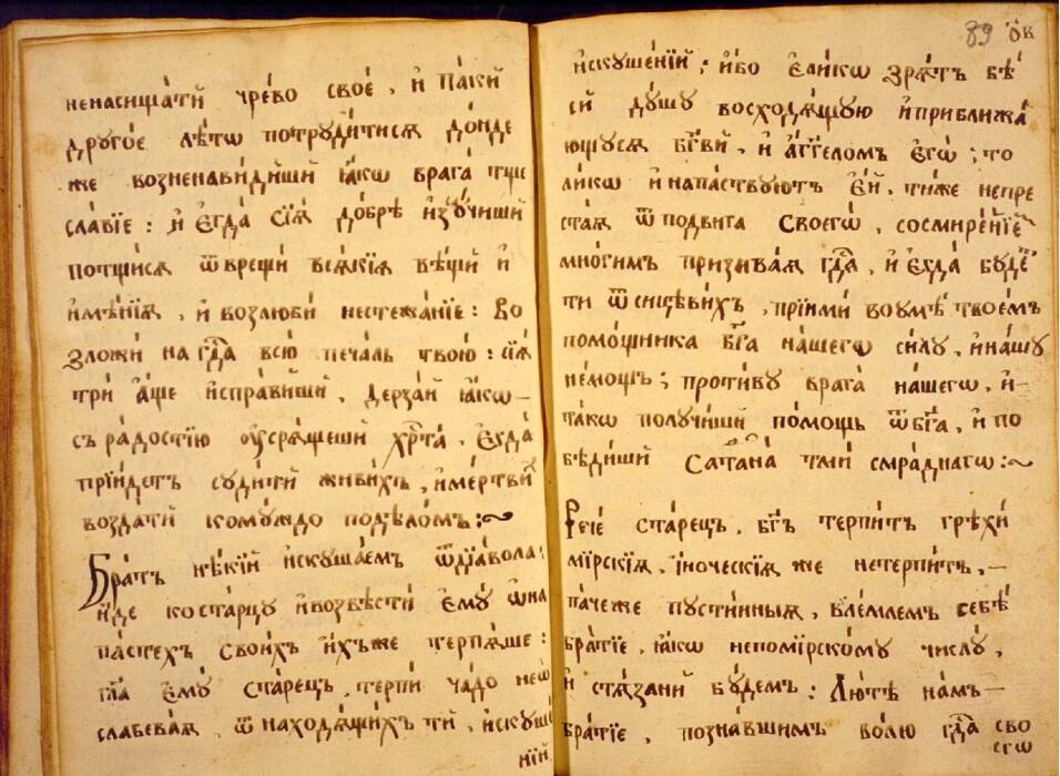 Писмо: Различен број на редови од 14 до 20, полуустав од црковно-словенски печатен тип. Јазикот е руско-црковно-словенски. Употребено е само црно мастило.